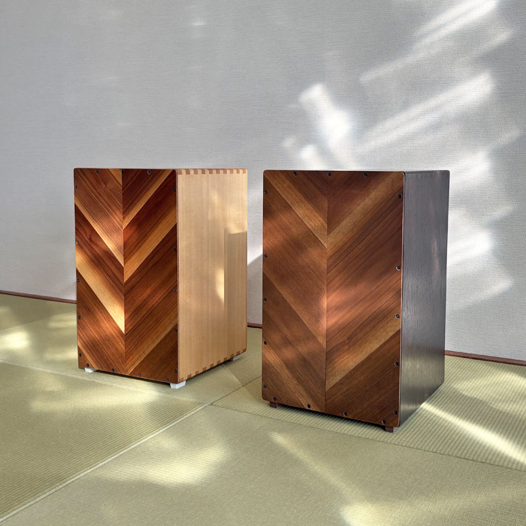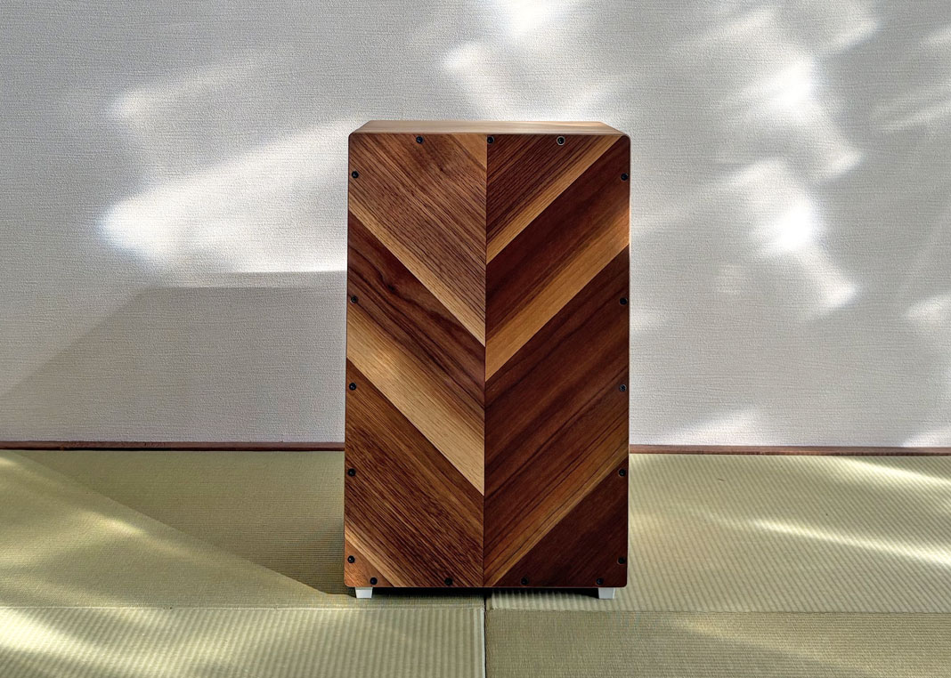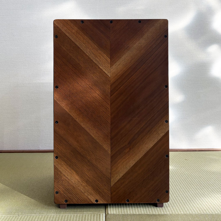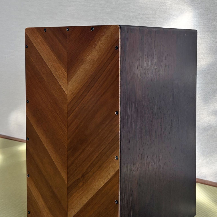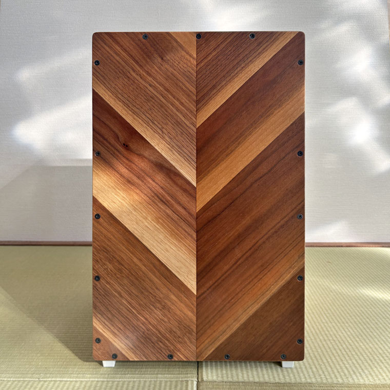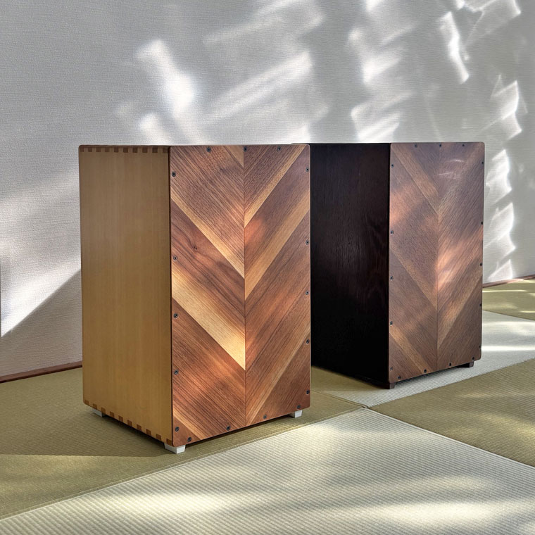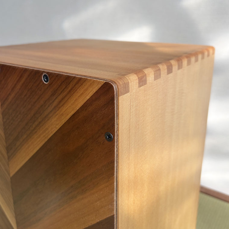 異なる木材を組み合わせ、正面にはヘリンボーン調の貼り分けを採用。一台ごとに表情が異なり、楽器でありながらインテリアとしても映える佇まいです。