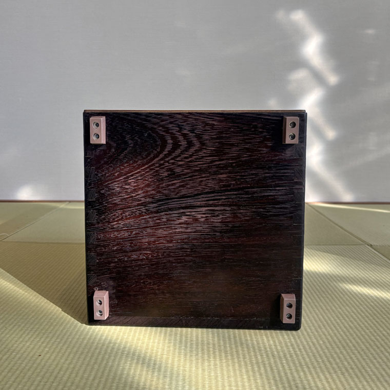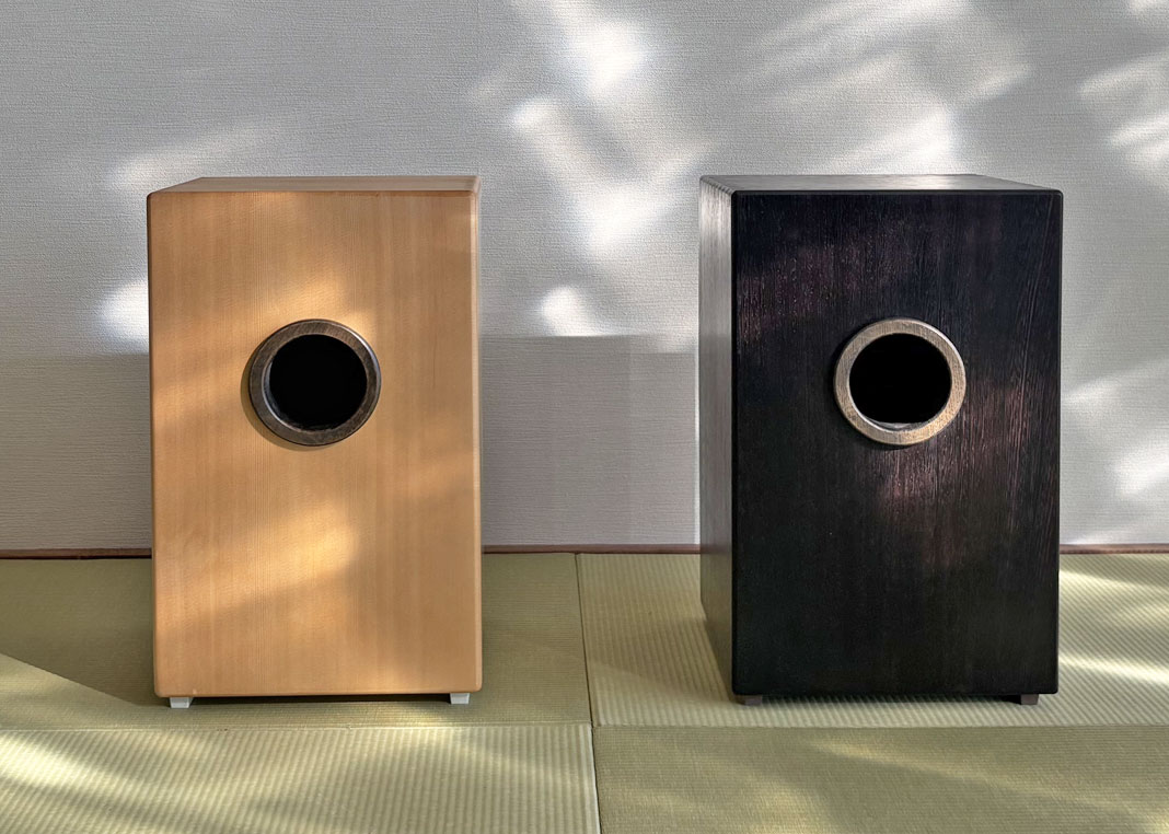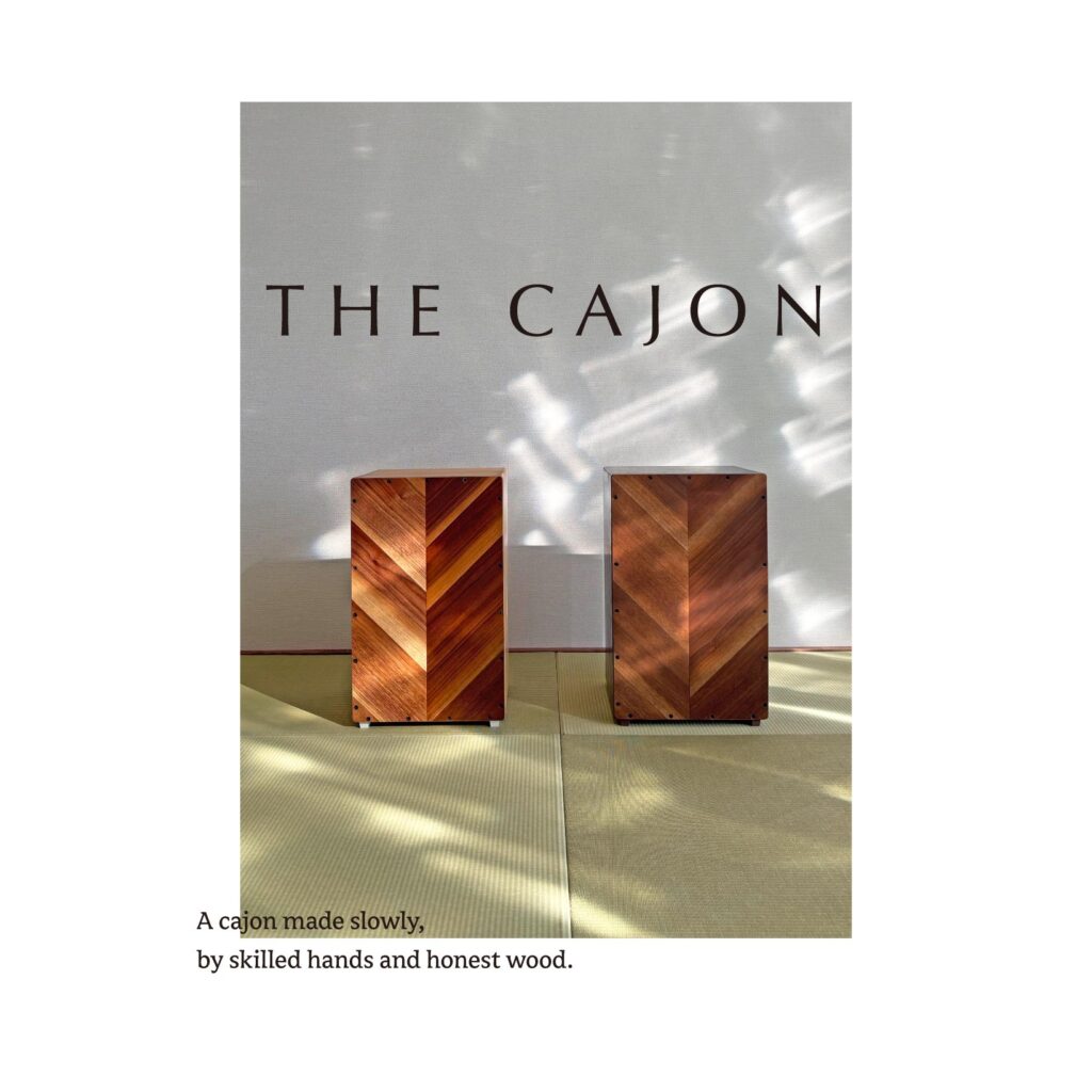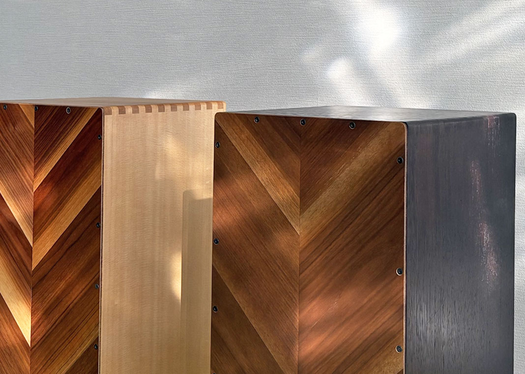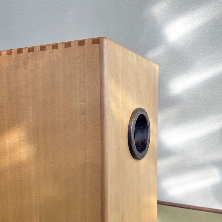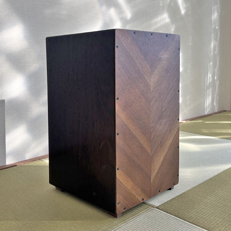 異なる木材を組み合わせ、正面にはヘリンボーン調の貼り分けを採用。一台ごとに表情が異なり、楽器でありながらインテリアとしても映える佇まいです。